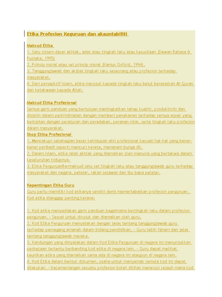 Doc Etika Kerja Dan Profesion Keguruan Alias Samah Academia Edu from 0.academia-photos.com Kamu harus memahami etika sebagai profesional yang tepat untuk tahu bagaimana bicara dan bertindak serta mengambil keputusan secara profesional. Memiliki perangkat kode etik profesional yang telah disepakati dan selalu dipatuhi serta dipedomani. Etika profesi akuntansi adalah merupakan suatu ilmu yang membahas perilaku perbuatan baik dan buruk manusia sejauh yang dapat dipahami oleh pikiran manusia terhadap pekerjaan yang membutuhkan pelatihan dan penguasaan terhadap suatu pengetahuan khusus sebagai akuntan. Kode etik profesional dapat dirancang untuk mendorong perilaku yg ideal sehingga harus bersifat relistik dan dapat ditegakkan. Etika profesi adalah sebagai sikap hidup untuk memenuhi kebutuhan pelayanan profesional dari klien dengan keterlibatan dan keahlian sebagai pelayanan dalam rangka kewajiban masyarakat sebagai keseluruhan terhadap para anggota masyarakat yang membutuhkannya dengan disertai refleksi yang. Manusia mempunyai berbagai macam kebutuhan diantaranya adalah kebutuhan untuk berinteraksi dengan manusia lain. Apabila syarikat dijalankan secara beretika, kemungkinan kesetiaan pelanggan jauh lebih tinggi. Menurut muchtar kusuma atmadja bahwa setiap profesi menempatkan ahli yang.
