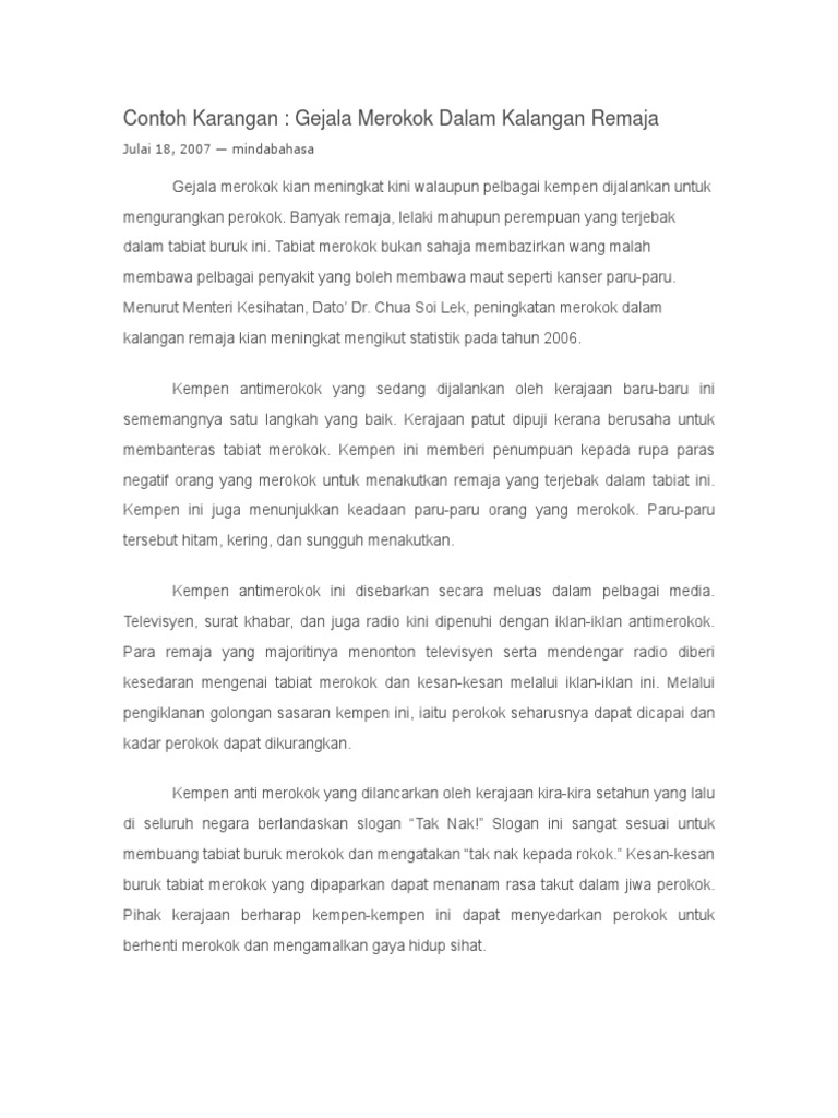 Pada masa ini, penggunaan laman sosial melalui internet amat popular di malaysia. Kebiasaan merokok dapat mengantarkan anda kepada kematian. Televisyen sering dianggap sebagai satu ciptaan moden yang banyak membawa kebaikan kepada manusia pada zaman moden ini. Mengatasi masalah kenakalan remaja di era modern 1. Banyak yang berasumsi bahwa merokok dengan menggunakan rokok mentol jauh lebih aman dibanding rokok jenis lainnya. Sejak belakangan ini budaya merokok dalam kalangan pelajar sekolah semakin serius (a2). Gejala merokok dalam kalangan re. Pada entri kali ini, kami ingin berkongsi tips berguna, contoh karangan syarahan dan format karangan buat panduan dan rujukan para pelajar semua sama ada sebagai latihan harian mahupun peperiksaan yang sebenar. Panduan kerja kursus pendidikan moral 2012 jadi, bukan hanya mereka yang merokok yang mendapat keburukan malahan, orang sekeliling turut merasa kesukaran untuk mendapatkan udara yang bersih. 32 downloads 312 views 20kb size. Bahaya rokok research papers academia edu. Mengetahui pola perilaku remaja judul : Hal ini kerana didapati banyak aktiviti penerokaan hutan dibuat secara tidak terancang.
