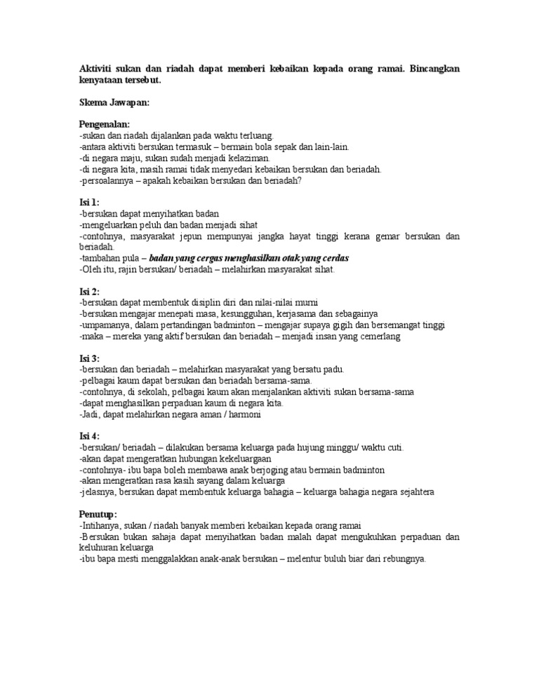 Kepentingan sukan kepada negara karangan doc faedah faedah melibatkan diri dalam aktiviti sukan abbas harun academia edu faedah faedah bersukan kepada masyarakat Bertempat di aras 2 janm sibu suatu sukan dalaman anjuran kesan telah diadakan. Taraf sukan negara akan meningkat. Penganjur acara sukan wajar mempertimbang untuk menangguhkan sebarang program atau kejohanan khususnya yang melibatkan aktiviti luar ketika cuaca panas dan kering akibat fenomena el nino sekarang. Wawasan 2020 yang bertujuan mewujudkan malaysia sebagai negara maju menjelang tahun 2020, merupakan antara tiga aspek kepimpinan tun dr mahathir mohamad sebagai perdana menteri yang meninggalkan kesan besar kepada pembangunan negara, kata datuk seri najib tun razak. Persoalannya, bersediakah kita jika kerajaan mengisytiharkan lockdown dan menghadapi kesan lockdown? Sebenarnya, sukan ini membawa banyak faedah kepada individu, masyarakat, dan negara secara tersirat.impak positif penglibatan sukan kepada individu ini ialah diri mereka akan berasa puas dapat melakukan sesuatu aktiviti tersebut. Penangguhan olimpik tokyo telah mencetus gelombang kejutan ke seluruh dunia sukan dan memberi kesan kepada atlet. Hal ini akan menyumbang kepada pertumbuhan ekonomi negara yang mapan. Kelembapan ekonomi china mula memberi kesan kepada permintaan barangan negara. Punca kesan negatif langkah menangani. Kepentingan bersukan kepada masyarakat dan negara. Meningkatkan produktiviti atlet negara dan pemain negara dalam bidang sukan.